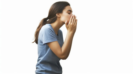 Generative AI : A sneezing woman isolated on white background