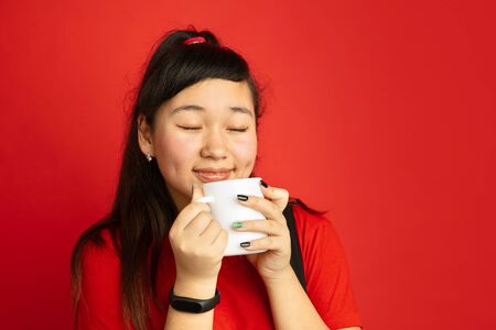 Asian teenagers portrait isolated on red studio background. Beautiful female brunette model with long hair in casual style. Concept of human emotions, facial expression, sales, ad. Drinks tea, coffee.