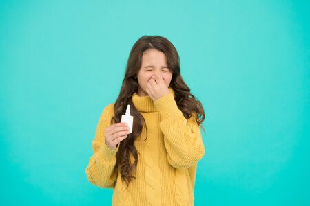 Sneezing. Kid use effective medicines. Girl hold nasal drops. Allergy concept. Home treatment. Nasal drops plastic bottle. Effective nasal spray. Flu concept. Runny nose and other symptoms of cold
