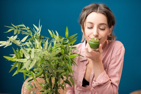 Portrait of a young smiling woman enjoying aroma cream sitting with green plant on the blue wall background at home