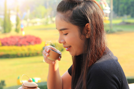 caucasian woman relax with drinking tea at balcony home in morning,girl smiling happiness with hot drink,lady and health drinks
