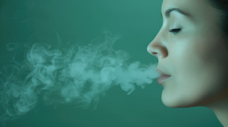 A close-up profile of a woman exhaling smoke against a dark background, with the light emphasizing the texture and movement of the smoke in a dramatic and artistic composition.