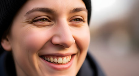 A close-up portrait of a young woman with a genuine, happy smile, showing crow's feet wrinkles around her eyes. She is wearing a beanie, and the natural lighting highlights her authentic expression. The image conveys joy, happiness, authenticity, and natural beauty.