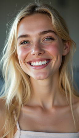 A beautiful young woman with long, flowing blonde hair beams with a bright smile, radiating happiness and warmth. Her sparkling blue eyes and natural glow create an inviting atmosphere, perfect for capturing the essence of joy and positivity.