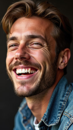 A cheerful man with a well-groomed beard and wearing a denim jacket is smiling widely. His expression exudes happiness and positivity, creating an inviting and friendly image.