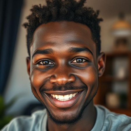 A close-up portrait shows a young man smiling with visible teeth. The image features soft lighting and a blurred background. This style could be used in various commercial applications. The focus is on the man's face, suggesting a mood of positivity and approachability. The image would be suitable for editorial or advertising purposes.