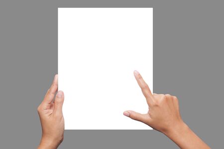 A man holds a white piece of paper. A flyer in the hands of a man. Prepared for your text. Isolated on a gray background.