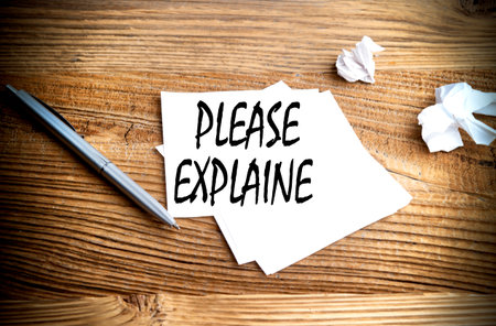 PLEASE EXPLAIN text written on a sticky on wooden background