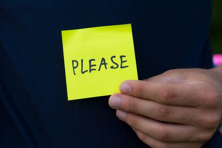 A young man holds a sticker in his hands with the inscription: PLEASE. Pitying emotion of asking for help, toned, lifestyle