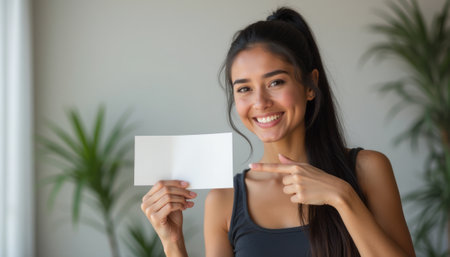 A joyful young woman with long dark hair smiles brightly while holding a blank card, inviting creativity and excitement. The soft, natural light and lush green plants in the background create a warm and inviting atmosphere, perfect for sharing messages or announcements.