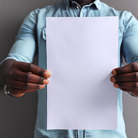 Woman holding a vertical white empty paper sheet, ideal for adding custom text or creative designs in various marketing contexts