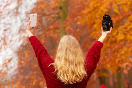 Pretty woman in fall forest park taking selfie self photo with old vintage camera and smartphone. Gorgeous young girl photographer. Autumn winter photography. Back rear view.