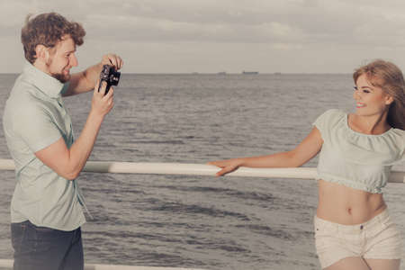 Young couple in love is taking photos on sea pier. Boyfriend photographing his lovely girlfriend outdoor on sea pier