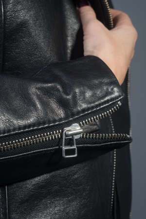 Stylish rock leather jacket with metal zipper, closeup. fashion woman