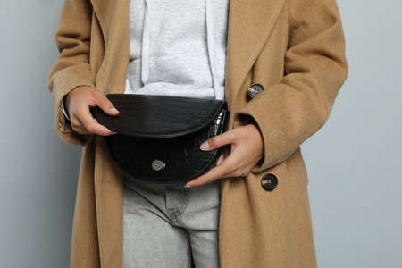 Young African American woman with stylish waist bag on gray background, closeup