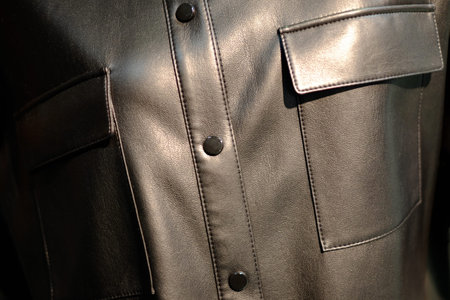 Background black leather texture colose-up with buttons and pocket. Part of a leather jacket