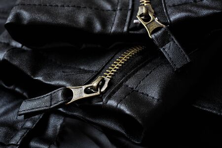 fastens the lock on a Black leather jacket with zipper close-up