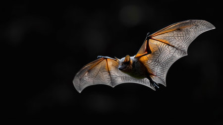 The bat displays its wings wide open, revealing fine textures and a unique body shape. This close view allows for an appreciation of its natural beauty and the adaptability of this nocturnal creature.