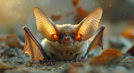 A small bat with distinct ears and fur sits on the forest floor surrounded by autumn leaves showing its curious expression in low light.