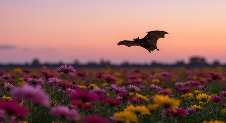 Bat flying over a meadow full of purple daisies at sunset