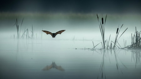 Bat flying at dusk over foggy lake, reflection visible