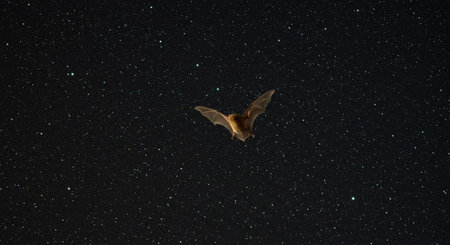 Bat flying in the night starry sky. Long-legged flying bat.