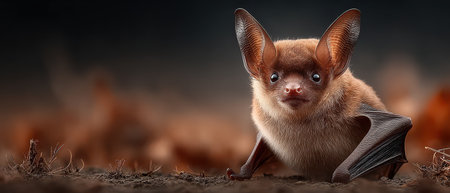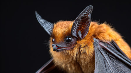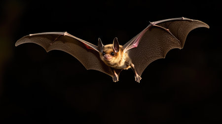This small brown bat displays its distinctive features with wide set glossy eyes and textured wings fully extended. The bats fur is a rich warm brown contrasting sharply with its lighter underbelly. The unique structure of its ears and the veins in its wings are clearly visible emphasizing the bats adaptations for nocturnal life