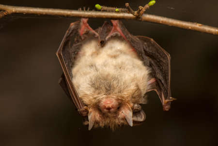Bechstein's Bat, Myotis bechsteinii, resting at night. Showing aggressive behavior by shoing its teeth.