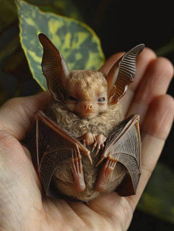 A small bat, wings folded and ears perked, resting in the palm, its unique features and nocturnal nature captured with lifelike detail and care.