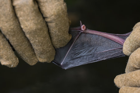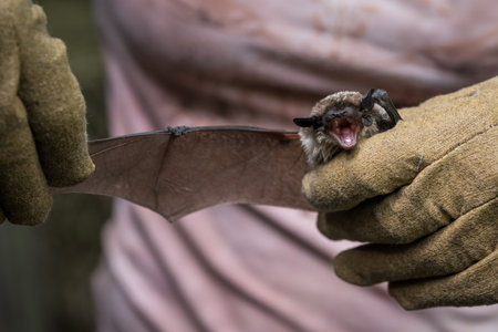 Chiropterologist holding and studying a bat in his hands
