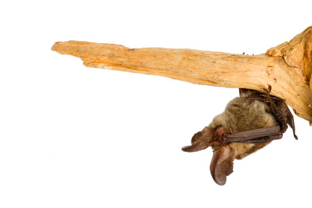 Bat hanging on a wooden stick on a white background, close-up
