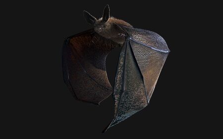 Bat with spread wings. Flying hunting animal isolated on black background.