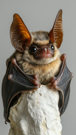 This adorable bat sits on a rock, showcasing its fluffy fur and oversized ears. Its bright eyes reflect curiosity and charm, making it a fascinating sight.