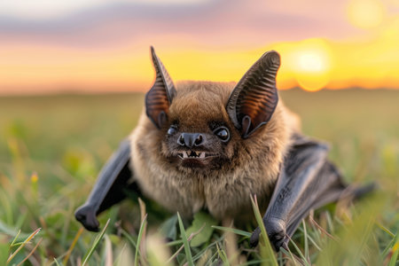 A close-up portrait of a brown bat with large ears, perched on the ground with its wings spread out The bat is looking directly at the camera, its teeth visible The background is a soft blur of grass and a sunset AI Generative