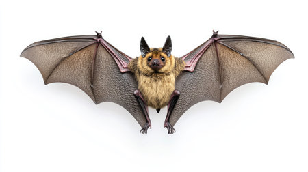 A small bat with large ears and eyes posing on a white backdrop, detailed texture of fur and wings visible