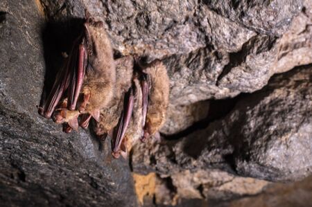 A group of brown bats sleeps on the ceiling of a rock cave. Wild little bats of the North Caucasus