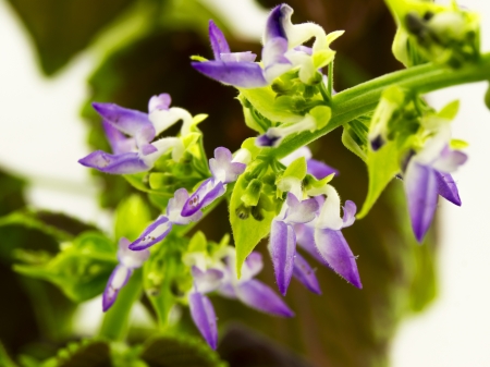Beautiful leaves and white flowers of Coleus Solenostemon scutellarioides. Plectranthus, known as coleus