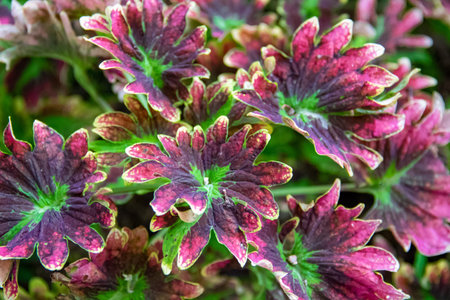 Close up green and red coleus solenostemon hybrida leaves background iin Santa Cruz, Tenerife