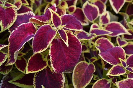 Coleus flower foliage background. Beautiful perspective of natural red coleus plant leaves in garden at summer sunny day.