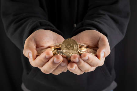 Poverty - kid begging for money. Dirty skinny beggar child's hands with coins on black background. Layout with free copy (text) space. Captured from above (top view).