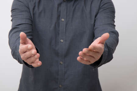 Hands giving gift box parcel over white background. Give the present with both hands.