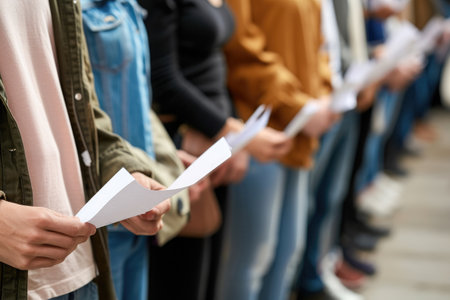 A group of individuals standing in a straight line, each holding papers in their hands, People in a long queue holding tax documents during tax season, AI Generated