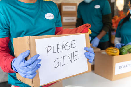Volunteer holding donation box with please give signage message - Concept of requesting people for social service