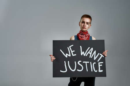 Cool tattooed young caucasian female activist looking at camera, holding cardboard banner with We want justice text, posing isolated over gray background