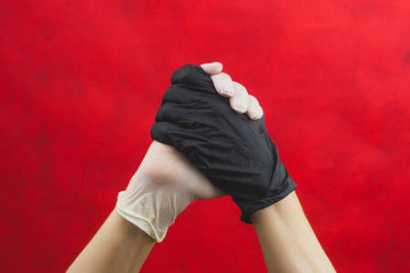Hands in protective gloves locked together. one hand in black glove, other in white. gesturing hands in medical gloves on a red background
