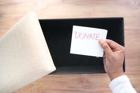 Lightbox board with word DONATE in black letters around US dollar banknotes. Money, Business, finance, investment, saving. Cash bill. Business budget of wealth and prosperity finance