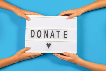 Two person hands holding light box with Donate word text over light blue background. Top view