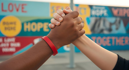 Handshake between dark skin and white skin shows respect and support with love hope and together in background. Connection between two people exactly 182 characters