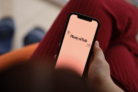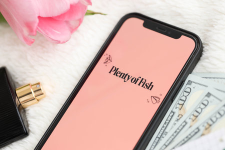KYIV, UKRAINE - FEBRUARY 23, 2024 Plenty of Fish logo of famous dating website or app on iPhone display screen close up