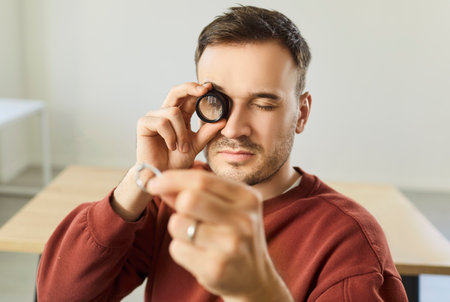 Closeup portrait of a young male jewellery appraiser inspecting gold ring looking through magnifying glass standing in workshop. Man jeweler and goldsmith evaluating jewelry in pawnshop.
